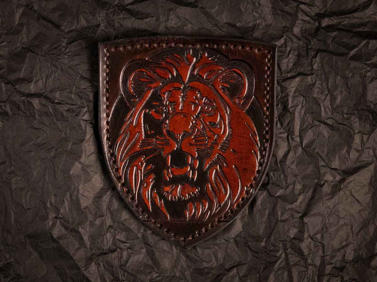 Це шкіряний патч із тисненим зображенням лева, що рикає, виконаний у формі щитового герба. Образ лева тут передано з максимальною експресією — розкритою пащею, напруженою гривою та загостреними рисами морди. Такий мотив символізує відвагу, силу, лідерство та незламність духу, — класичні риси воїна й захисника.