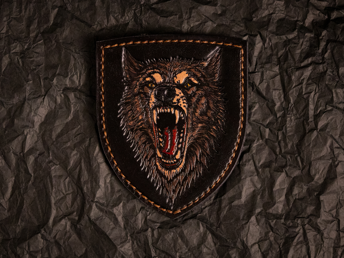 Патч виконано у темних відтінках чорного з акцентами коричневого та червоного, що підкреслює глибину тиснення. Деталі вовчої шкіри та зубів передані з високою точністю. Край патча обшитий вручну контрастною ниткою, що додає завершеності.