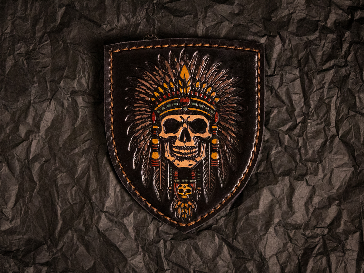 Це шкіряний патч із тисненим зображенням черепа з індіанським головним убором, виготовлений вручну з натуральної шкіри.